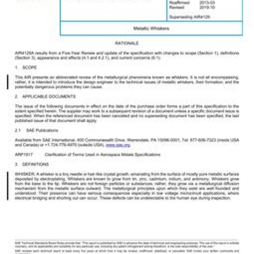 This AIR presents an abbreviated review of the metallurgical phenomena known as whiskers. It is not all encompassing; rather, it is intended to introduce the design engineer to the technical issues of metallic whiskers, their formation, and the potentially dangerous problems they can cause.