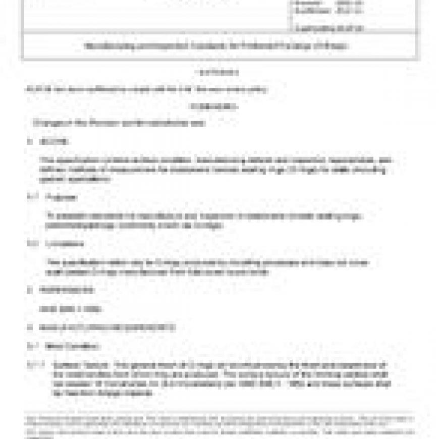 This specification controls surface condition, manufacturing defects and inspection requirements, and defines methods of measurement for elastomeric toroidal sealing rings (O-rings) for static (including gasket) applications. The specification refers only to O-rings produced by molding processes and does not cover scarf-jointed O-rings manufactured from fully-cured round cords.