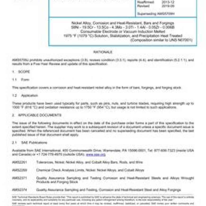 SAE AMS5709J Nickel Alloy, Corrosion and Heat-Resistant, Bars and Forgings 58Ni - 19.5Cr - 13.5Co - 4.3Mo - 3.0Ti - 1.4Al - 0.05Zr - 0.006B Consumable Electrode or Vacuum Induction Melted 1975 ¿¿F (1079 ¿¿C) Solution, Stabilization, and Precipitation Heat Treated