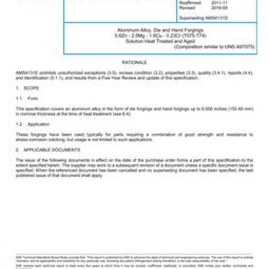SAE AMS4131E Aluminum Alloy, Die and Hand Forgings 5.6Zn - 2.5Mg - 1.6Cu - 0.23Cr (7075-T74) Solution Heat Treated and Aged