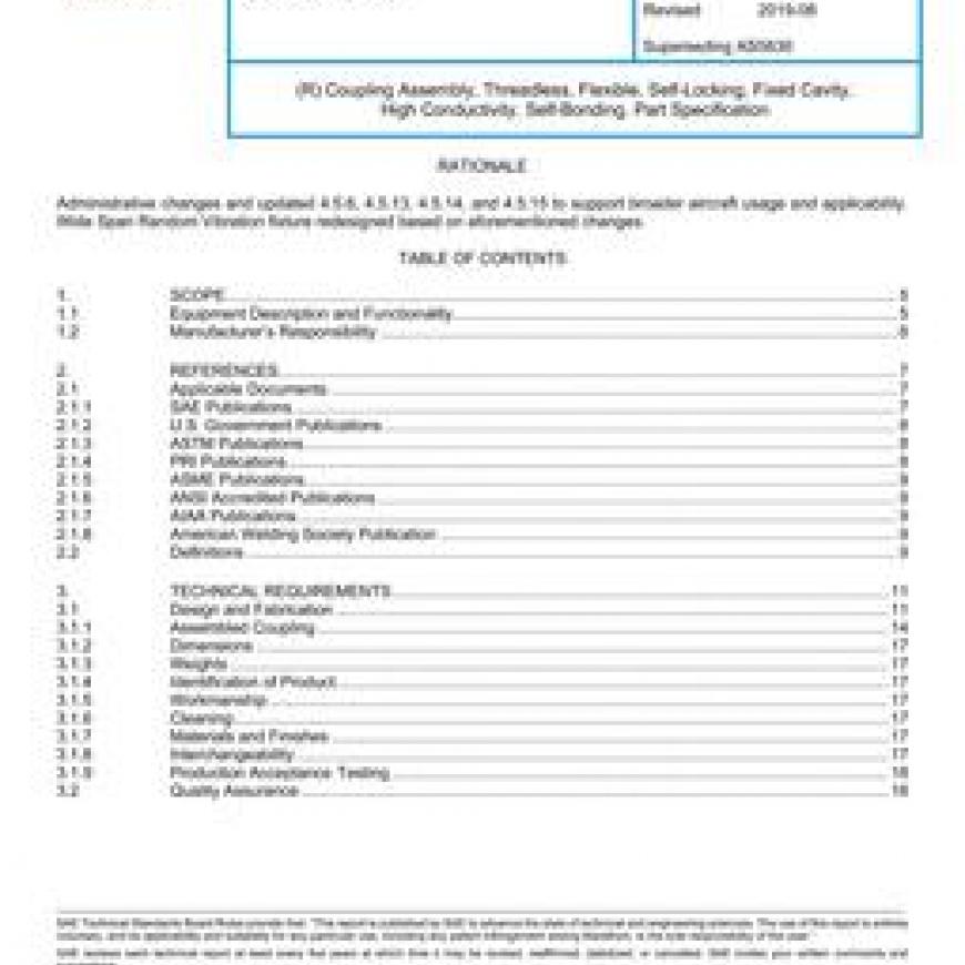 This SAE Aerospace Standard (AS) defines the requirements for a threadless, flexible, high conductive, self-bonding coupling assembly which, when installed on defined ferrules, provides a flexible connection for joining ducting and components in pressurized fluid systems. The assembled coupling is designed to provide interchangeability of parts and components between qualified manufacturers for use from -65 to +265 ¿¿F at 130 psi nominal operating pressures and for the service life of the aircraft system.