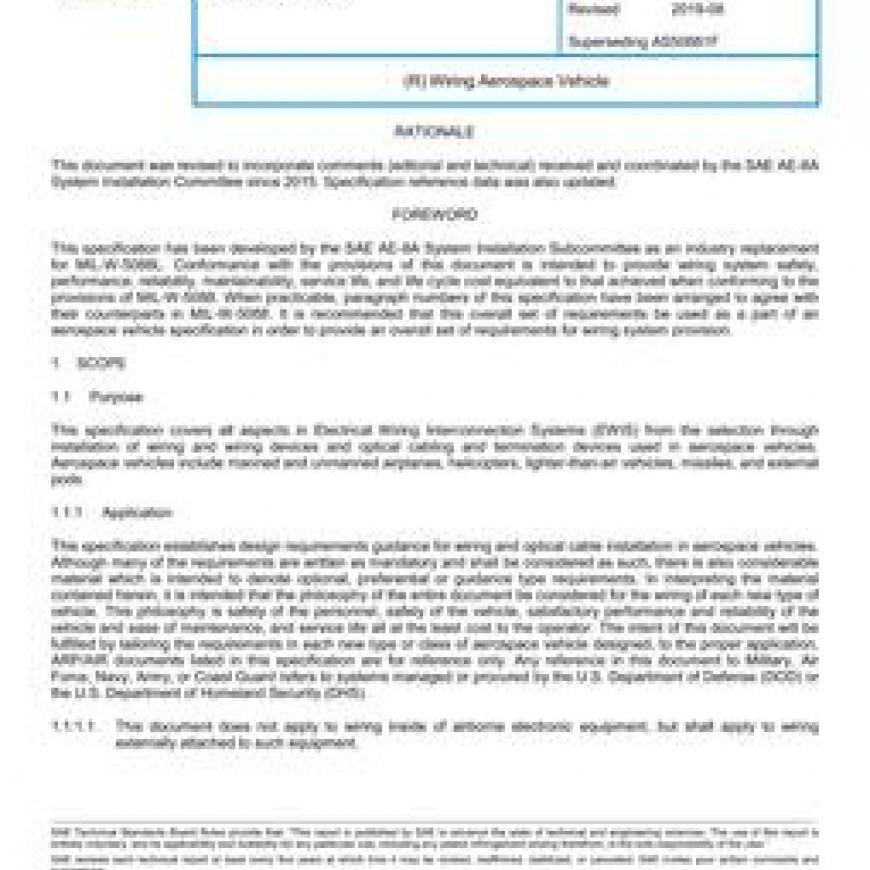 This specification covers all aspects in Electrical Wiring Interconnection Systems (EWIS) from the selection through installation of wiring and wiring devices and optical cabling and termination devices used in aerospace vehicles. Aerospace vehicles include manned and unmanned airplanes, helicopters, lighter-than-air vehicles, missiles, and external pods.