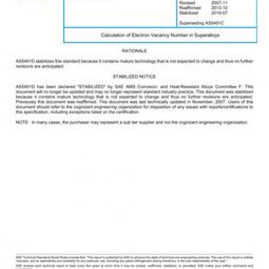 SAE AS5491D Calculation of Electron Vacancy Number in Superalloys (Stabilized: Jul 2019)