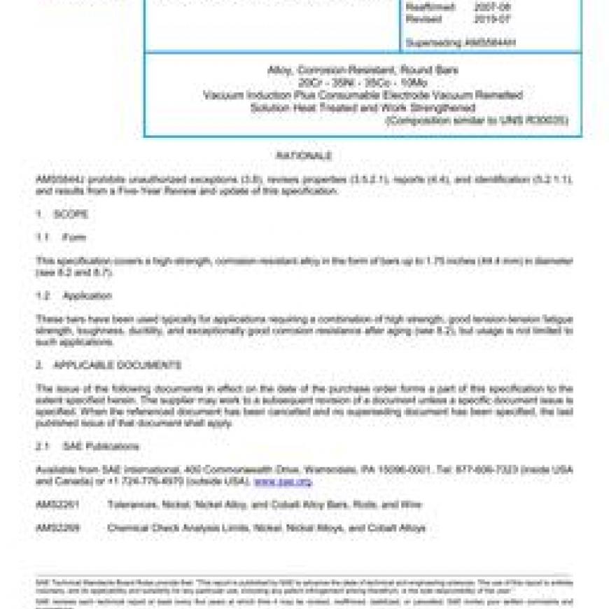 SAE AMS5844J Alloy, Corrosion-Resistant, Round Bars 20Cr - 35Ni - 35Co - 10Mo Vacuum Induction Plus Consumable Electrode Vacuum Remelted Solution Heat Treated and Work Strengthened