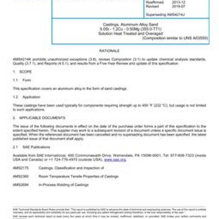 SAE AMS4214K Castings, Aluminum Alloy Sand 5.0Si - 1.2Cu - 0.50Mg (355.0-T71) Solution Heat Treated and Overaged