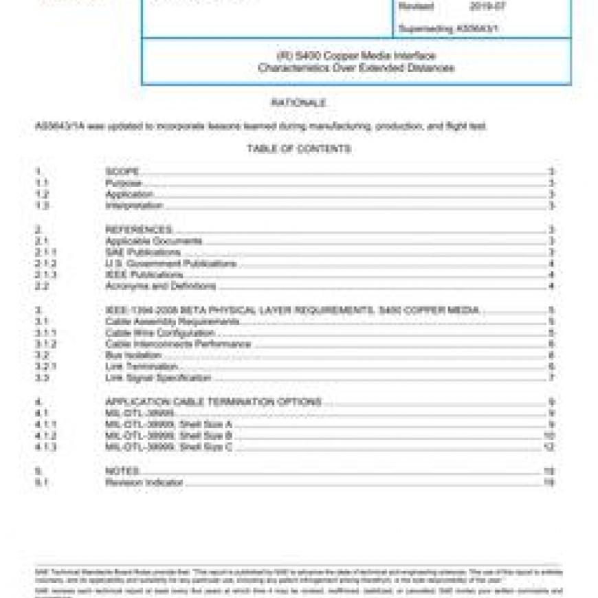 This SAE Aerospace Standard (AS) establishes guidelines for the use of IEEE-1394-2008 Beta (formerly IEEE-1394b) as a data bus network in military and aerospace vehicles. It encompasses the data bus cable and its interface electronics for a system utilizing S400 over copper medium over extended lengths. This document contains extensions/restrictions to "off-the-shelf" IEEE-1394 standards, and assumes that the reader already has a working knowledge of IEEE-1394.This document does not identify specific environmental requirements (electromagnetic compatibility, temperature, vibration, etc.); such requirements will be vehicle-specific and even LRU-specific. However, the hardware requirements and examples contained herein do address many of the environmental conditions that military and aerospace vehicles may experience. One should refer to the appropriate sections of MIL-STD-461E for their particular LRU, and utilize handbooks such as MIL HDBK-454A and MIL-HDBK-5400 for guidance.