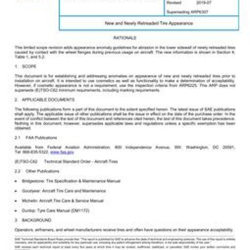 This document is for establishing and addressing anomalies on appearance of new and newly retreaded tires prior to installation on aircraft. It is intended to use cosmetics as well as functionality to make a determination of acceptability. However, if cosmetic appearance is not a requirement, use the inspection criteria from ARP6225, Aircraft Tire Removal Criteria. This ARP does not supersede (E)TSO-C62 minimum requirements, including marking requirements.