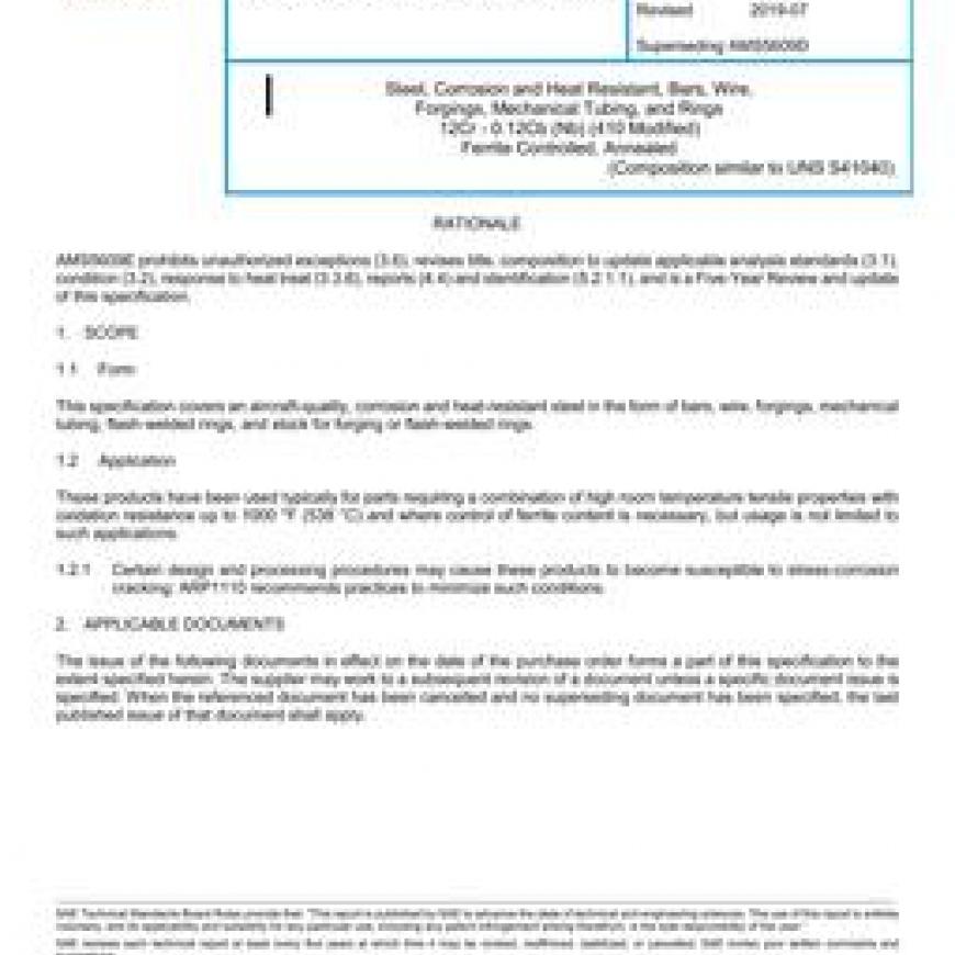SAE AMS5609E Steel, Corrosion and Heat Resistant, Bars, Wire, Forgings, Mechanical Tubing, and Rings 12Cr - 0.12Cb (Nb) (410 Modified) Ferrite Controlled, Annealed