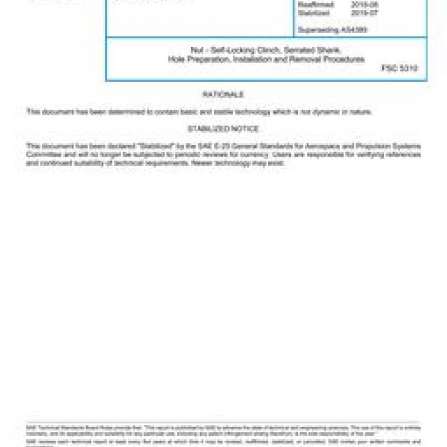 This SAE Aerospace Standard (AS) provides minimum design, hole preparation, installation and removal requirements for AS3272, AS3273, MA3274, and MA3275 serrated shank self-locking clinch nuts. This standard is applicable when specified on engineering drawings or in procurement documents.