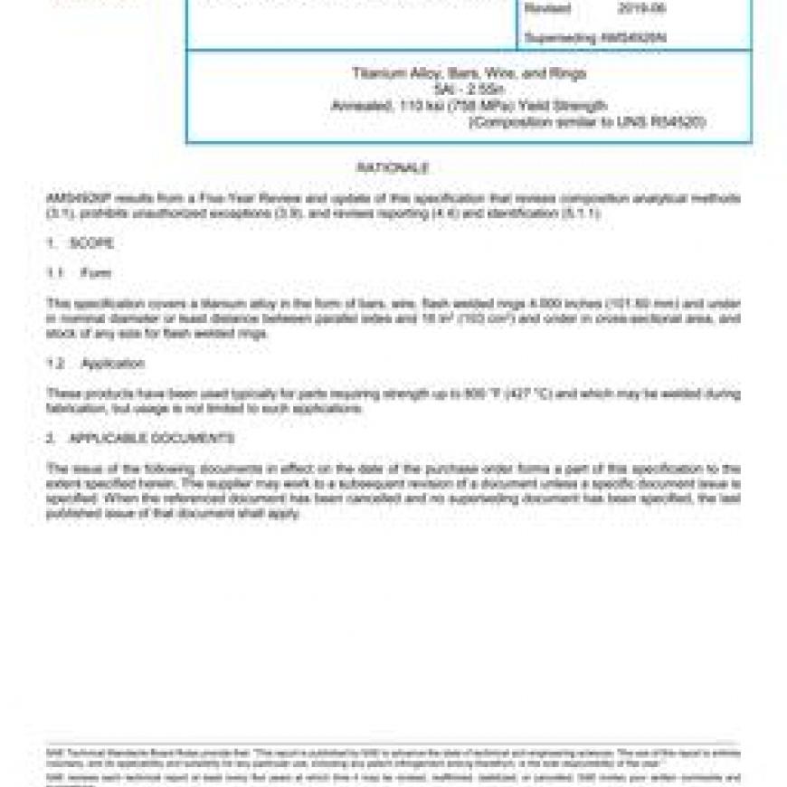 This specification covers a titanium alloy in the form of bars, wire, flash welded rings 4.000 inches (101.60 mm) and under in nominal diameter or least distance between parallel sides and 16 in2 (103 cm2) and under in cross-sectional area, and stock of any size for flash welded rings.