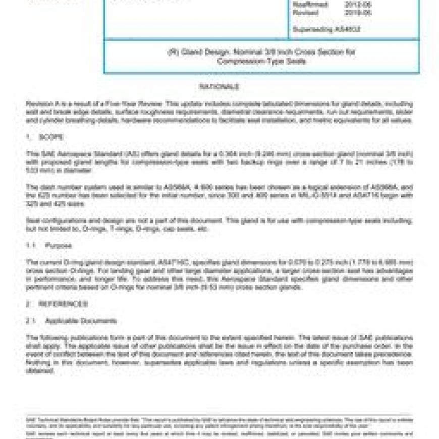 This SAE Aerospace Standard (AS) offers gland details for a 0.364 inch (9.246 mm) cross-section gland (nominal 3/8 inch) with proposed gland lengths for compression-type seals with two backup rings over a range of 7 to 21 inches (178 to 533 mm) in diameter. The dash number system used is similar to AS568A. A 600 series has been chosen as a logical extension of AS568A, and the 625 number has been selected for the initial number, since 300 and 400 series in MIL-G-5514 and AS4716 begin with 325 and 425 sizes. Seal configurations and design are not a part of this document. This gland is for use with compression-type seals including, but not limited to, O-rings, T-rings, D-rings, cap seals, etc.