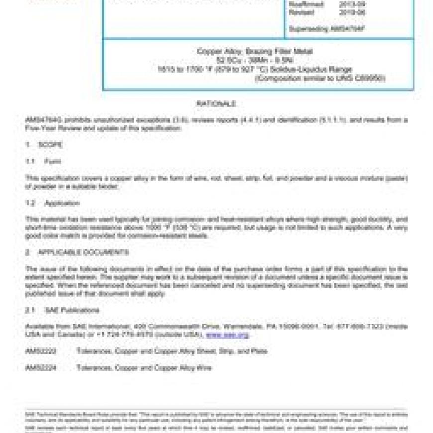 SAE AMS4764G Copper Alloy, Brazing Filler Metal 52.5Cu - 38Mn - 9.5Ni 1615 to 1700 ¿¿F (879 to 927 ¿¿C) Solidus-Liquidus Range