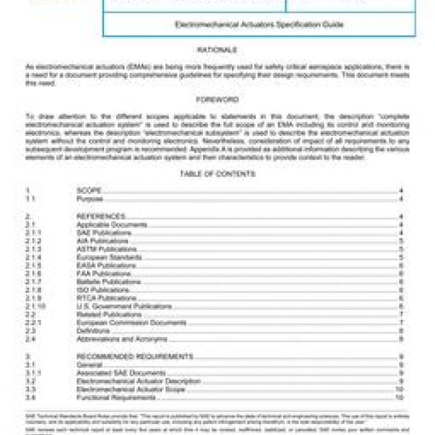 This Aerospace Recommended Practice (ARP) provides general characteristics, requirements, and design data to be recommended for inclusion in a procurement technical specification of an electromechanical actuator (EMA), including its control and monitoring.
