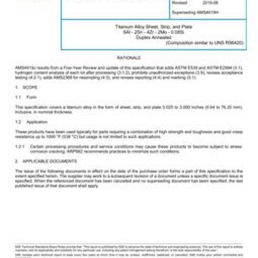 SAE AMS4919J Titanium Alloy Sheet, Strip, and Plate 6Al - 2Sn - 4Zr - 2Mo - 0.08Si Duplex Annealed