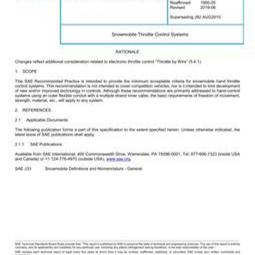 This SAE Recommended Practice is intended to provide the minimum acceptable criteria for snowmobile hand throttle control systems. This recommendation is not intended to cover competition vehicles, nor is it intended to limit development of new and/or improved technology in controls. Although these recommendations are primarily addressed to hand-control systems using an outer flexible conduit with a multiple strand inner cable, the basic requirements of freedom of movement, strength, material, etc., will apply to any system.