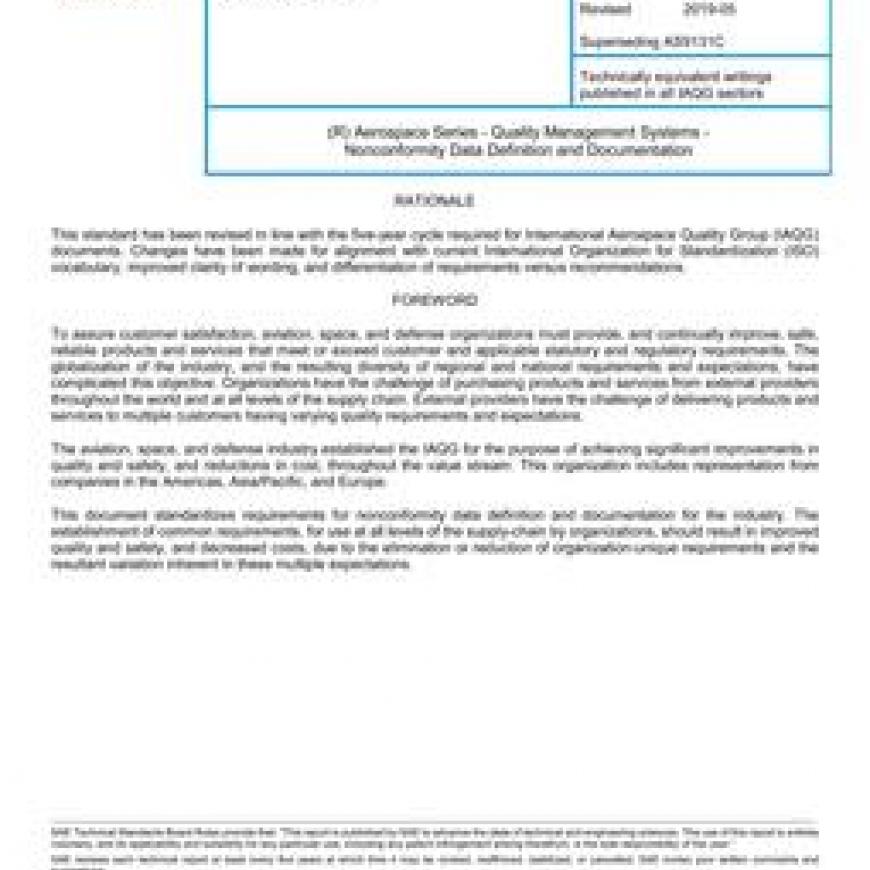 This standard defines the common nonconformity data definition and documentation that shall be exchanged between an internal/external supplier or sub-tier supplier, and the customer when informing about a nonconformity requiring formal decision. The requirements are applicable, partly or totally, when reporting a product nonconformity to the owner or operator, as user of the end item (e.g., engine, aircraft, spacecraft, helicopter), if specified by contract. Reporting of nonconformity data, either electronically or conventionally on paper, is subject to the terms and conditions of the contract. This also includes, where applicable, data access under export control regulations.