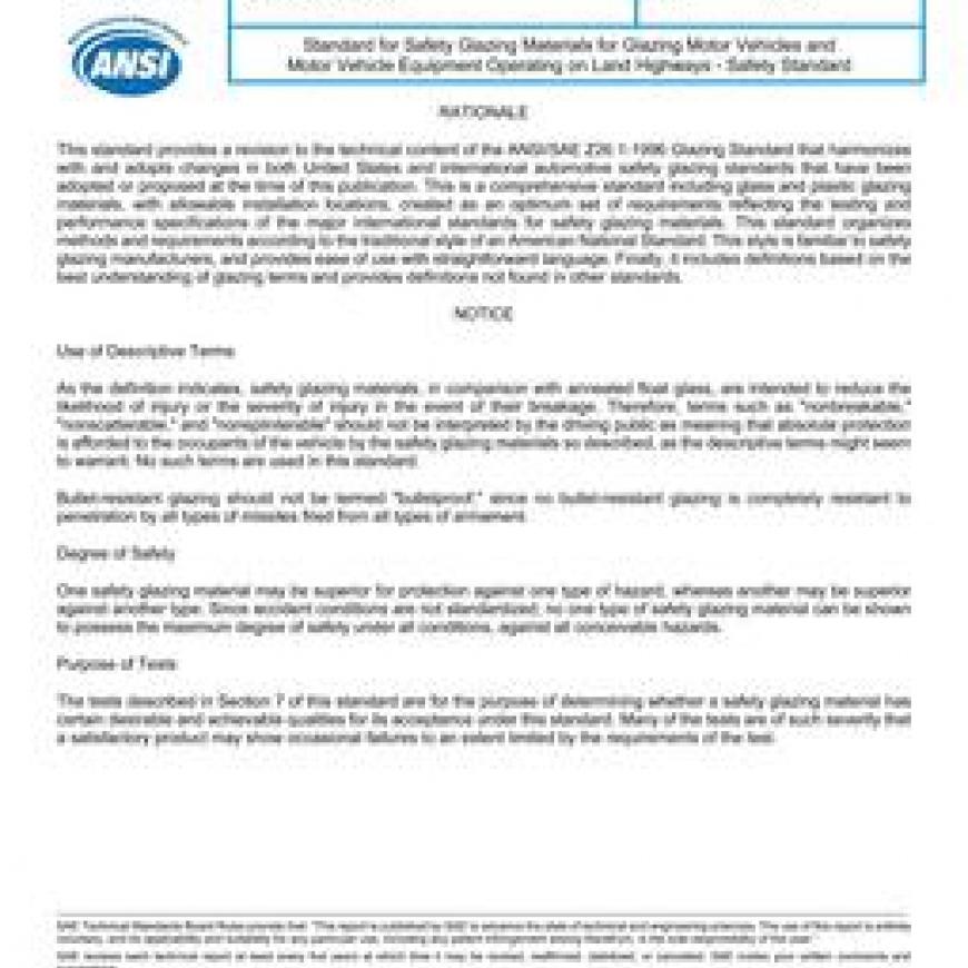 Standard for Safety Glazing Materials for Glazing Motor Vehicles and Motor Vehicle Equipment Operating on Land Highways - Safety Standard