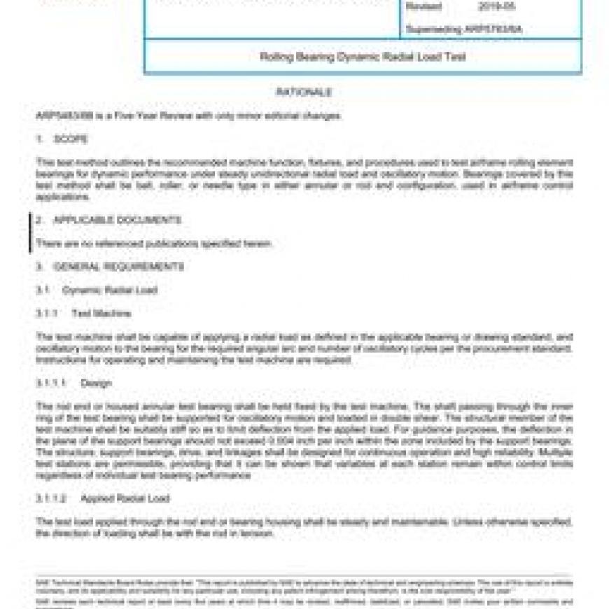 This test method outlines the recommended machine function, fixtures, and procedures used to test airframe rolling element bearings for dynamic performance under steady unidirectional radial load and oscillatory motion. Bearings covered by this test method shall be ball, roller, or needle type in either annular or rod end configuration, used in airframe control applications.