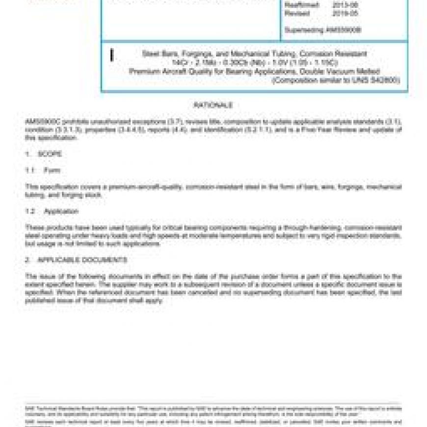 SAE AMS5900C Steel Bars, Forgings, and Mechanical Tubing, Corrosion Resistant 14Cr - 2.1Mo - 0.30Cb (Nb) - 1.0V (1.05 - 1.15C) Premium Aircraft Quality for Bearing Applications, Double Vacuum Melted