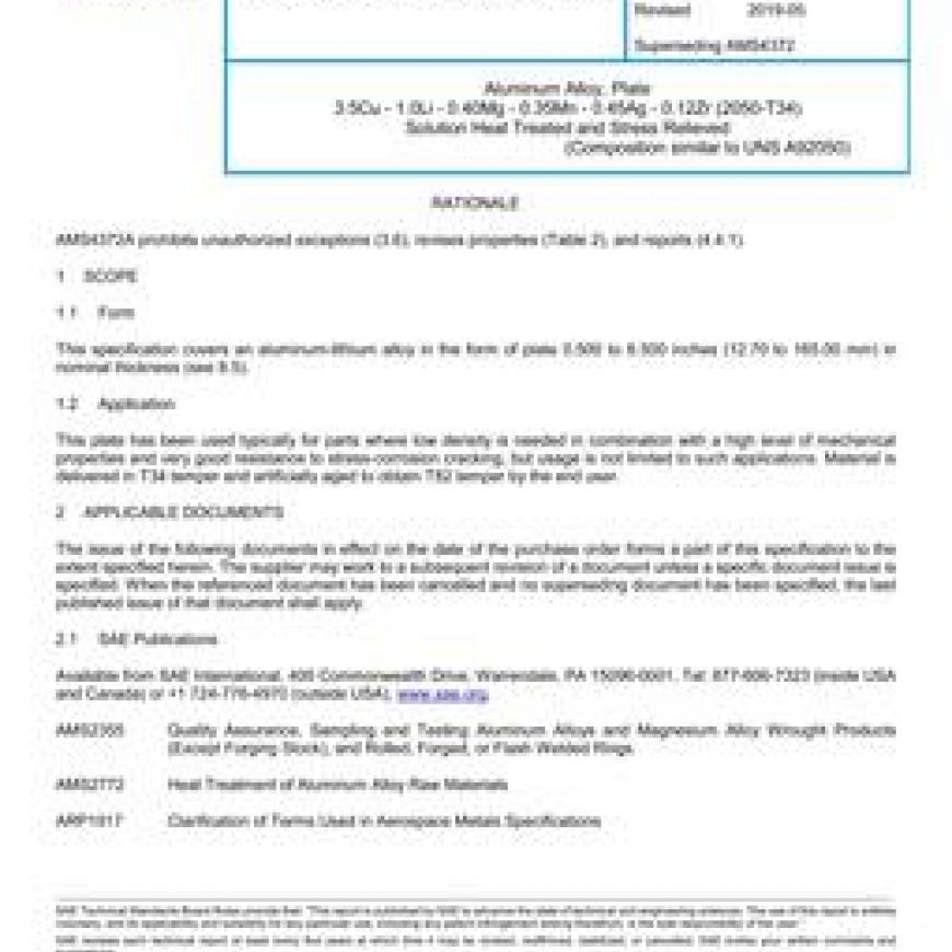 SAE AMS4372A Aluminum Alloy, Plate 3.5Cu - 1.0Li - 0.40Mg - 0.35Mn - 0.45Ag - 0.12Zr (2050-T34) Solution Heat Treated and Stress Relieved