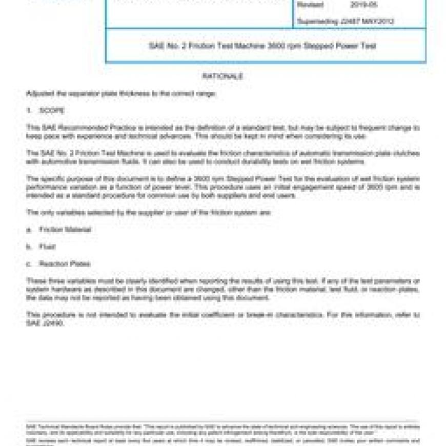 This SAE Recommended Practice is intended as the definition of a standard test, but may be subject to frequent change to keep pace with experience and technical advances. This should be kept in mind when considering its use.The SAE No. 2 Friction Test Machine is used to evaluate the friction characteristics of automatic transmission plate clutches with automotive transmission fluids. It can also be used to conduct durability tests on wet friction systems.The specific purpose of this document is to define a 3600 rpm Stepped Power Test for the evaluation of wet friction system performance variation as a function of power level. This procedure uses an initial engagement speed of 3600 rpm and is intended as a standard procedure for common use by both suppliers and end users.The only variables selected by the supplier or user of the friction system are:a. Friction Material