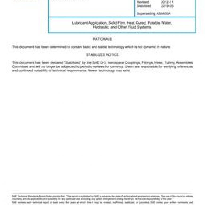 This SAE Aerospace Standard (AS) establishes the surface pretreatment, temperature, and baking time required to cure AS6449 Type I and Type II solid film lubricant (SFL) when it is applied over the surfaces of manufactured parts of various metals. Application method may be dipping or spraying.