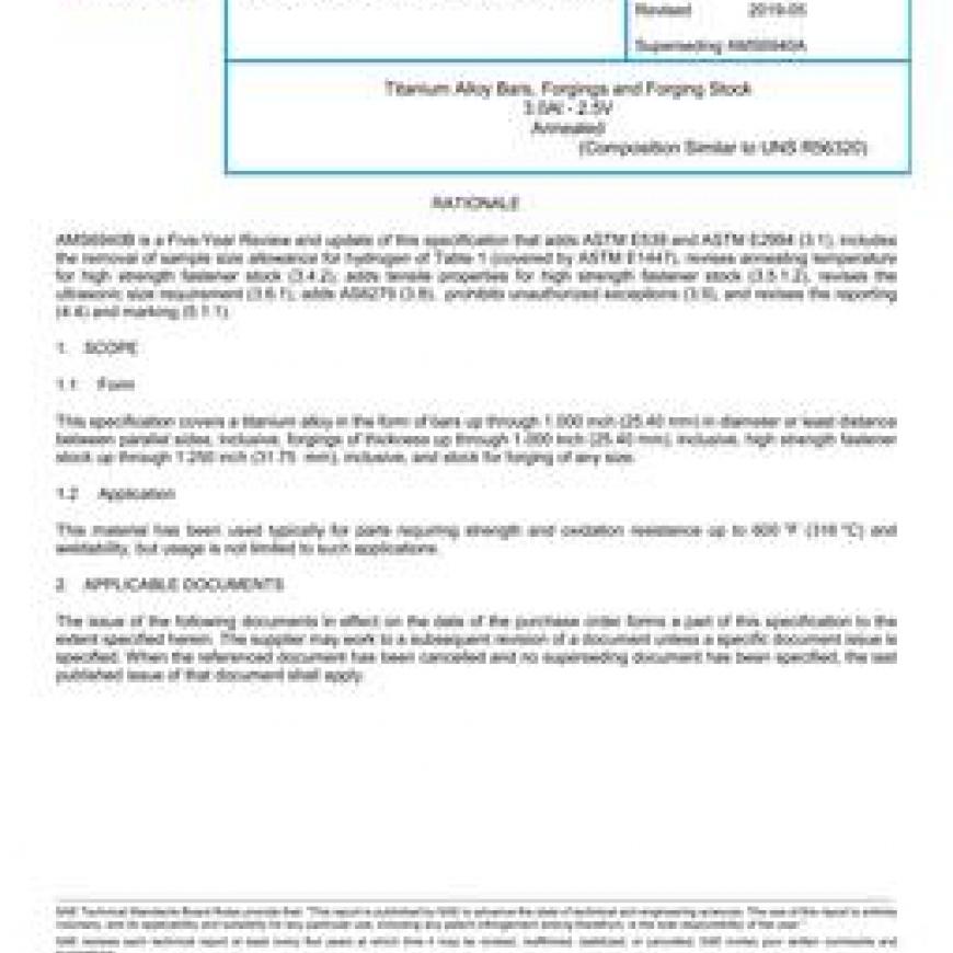 This specification covers a titanium alloy in the form of bars up through 1.000 inch (25.40 mm) in diameter or least distance between parallel sides, inclusive, forgings of thickness up through 1.000 inch (25.40 mm), inclusive, high strength fastener stock up through 1.250 inch (31.75 mm), inclusive, and stock for forging of any size.