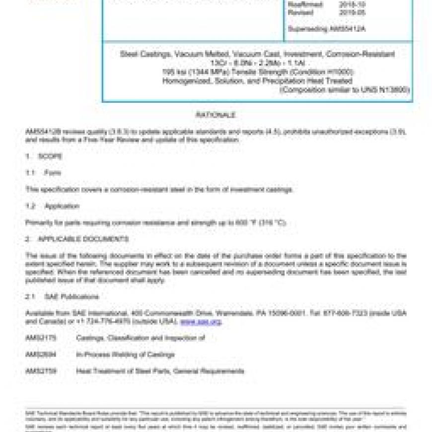 SAE AMS5412B Steel Castings, Vacuum Melted, Vacuum Cast, Investment, Corrosion-Resistant 13Cr - 8.0Ni - 2.2Mo - 1.1Al 195 ksi (1344 MPa) Tensile Strength (Condition H1000) Homogenized, Solution, and Precipitation Heat Treated