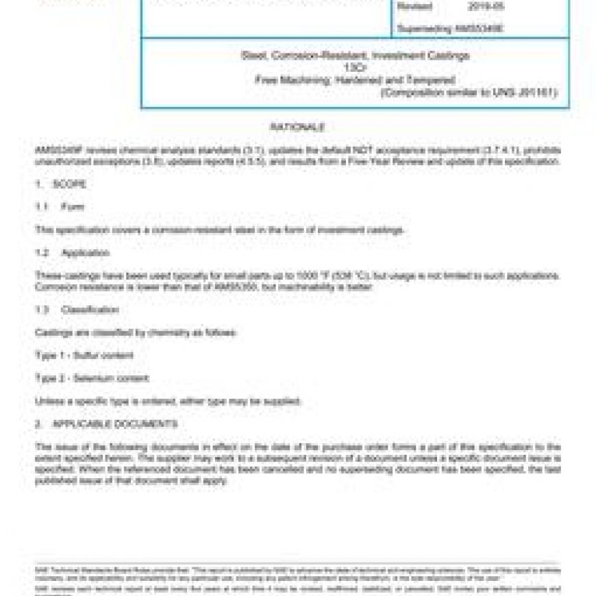 SAE AMS5349F Steel, Corrosion-Resistant, Investment Castings 13Cr Free Machining; Hardened and Tempered