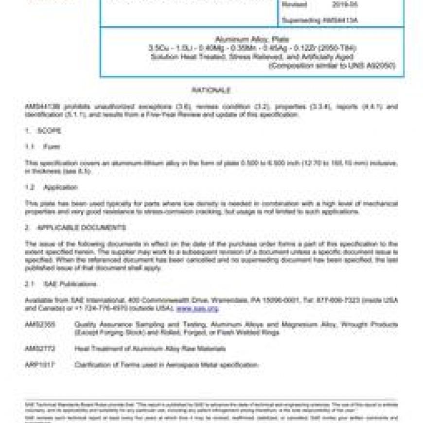SAE AMS4413B Aluminum Alloy, Plate 3.5Cu - 1.0Li - 0.40Mg - 0.35Mn - 0.45Ag - 0.12Zr (2050-T84) Solution Heat Treated, Stress Relieved, and Artificially Aged