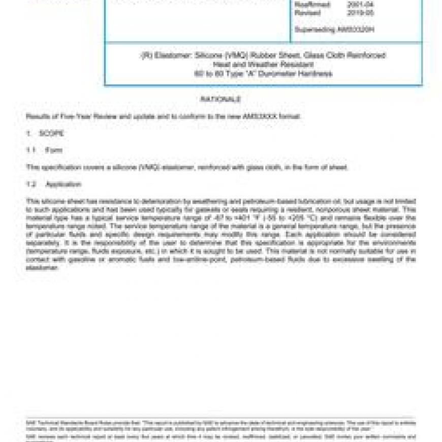 SAE AMS3320J Elastomer: Silicone (VMQ) Rubber Sheet, Glass Cloth Reinforced Heat and Weather Resistant 60 to 80 Type ¿¿¿A¿¿¿ Durometer Hardness