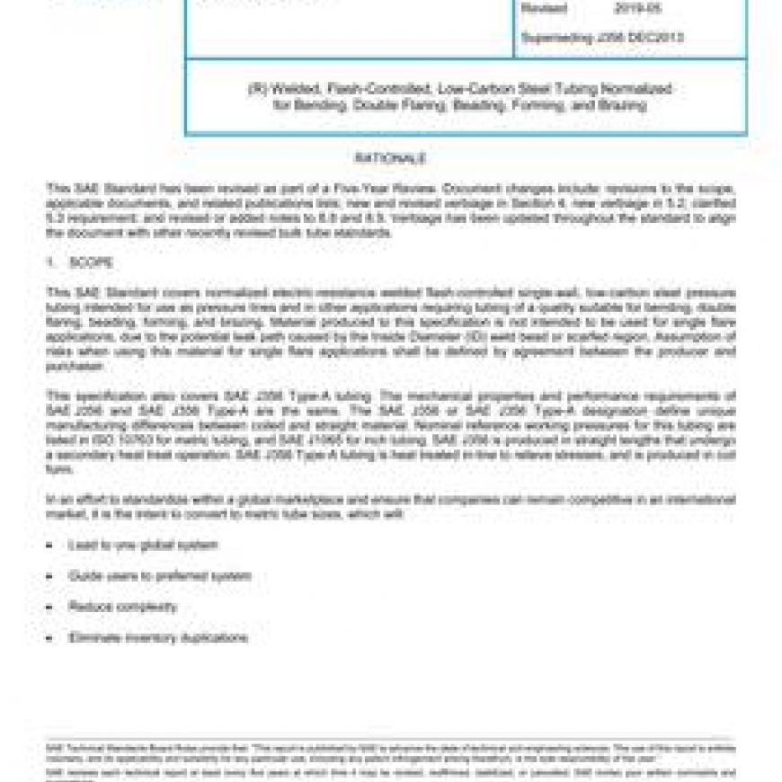 This SAE Standard covers normalized electric-resistance welded flash-controlled single-wall, low-carbon steel pressure tubing intended for use as pressure lines and in other applications requiring tubing of a quality suitable for bending, double flaring, beading, forming, and brazing. Material produced to this specification is not intended to be used for single flare applications, due to the potential leak path caused by the Inside Diameter (ID) weld bead or scarfed region. Assumption of risks when using this material for single flare applications shall be defined by agreement between the producer and purchaser.This specification also covers SAE J356 Type-A tubing. The mechanical properties and performance requirements of SAE J356 and SAE J356 Type-A are the same. The SAE J356 or SAE J356 Type-A designation define unique manufacturing differences between coiled and straight material. Nominal reference working pressures for this tubing are listed in ISO 10763 for metric tubing, and SAE J1065 for inch tubing. SAE J356 is produced in straight lengths that undergo a secondary heat treat operation. SAE J356 Type-A tubing is heat treated in-line to relieve stresses, and is produced in coil form.In an effort to standardize within a global marketplace and ensure that companies can remain competitive in an international market, it is the intent to convert to metric tube sizes, which will: Lead to one global system Guide users to preferred system Reduce complexity Eliminate inventory duplications