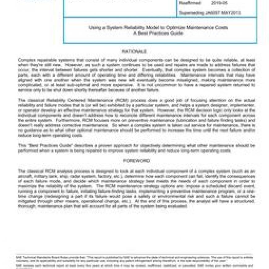 SAE JA6097 ("Using a System Reliability Model to Optimize Maintenance") shows how to determine which maintenance to perform on a system when that system requires corrective maintenance to achieve the lowest long-term operating cost. While this document may focus on applications to Jet Engines and Aircraft, this methodology could be applied to nearly any type of system. However, it would be most effective for systems that are tightly integrated, where a failure in any part of the system causes the entire system to go off-line, and the process of accessing a failed component can require additional maintenance on other unrelated components.
