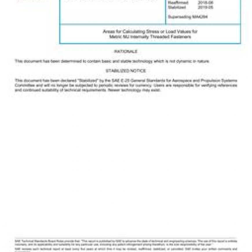 Areas for the standard metric series of threaded diameter-pitch combinations for aerospace internally threaded fasteners are established for the following conditions:a. Area for shear stress or load in fastener thread b. Area for ultimate tensile stress or load in thread
