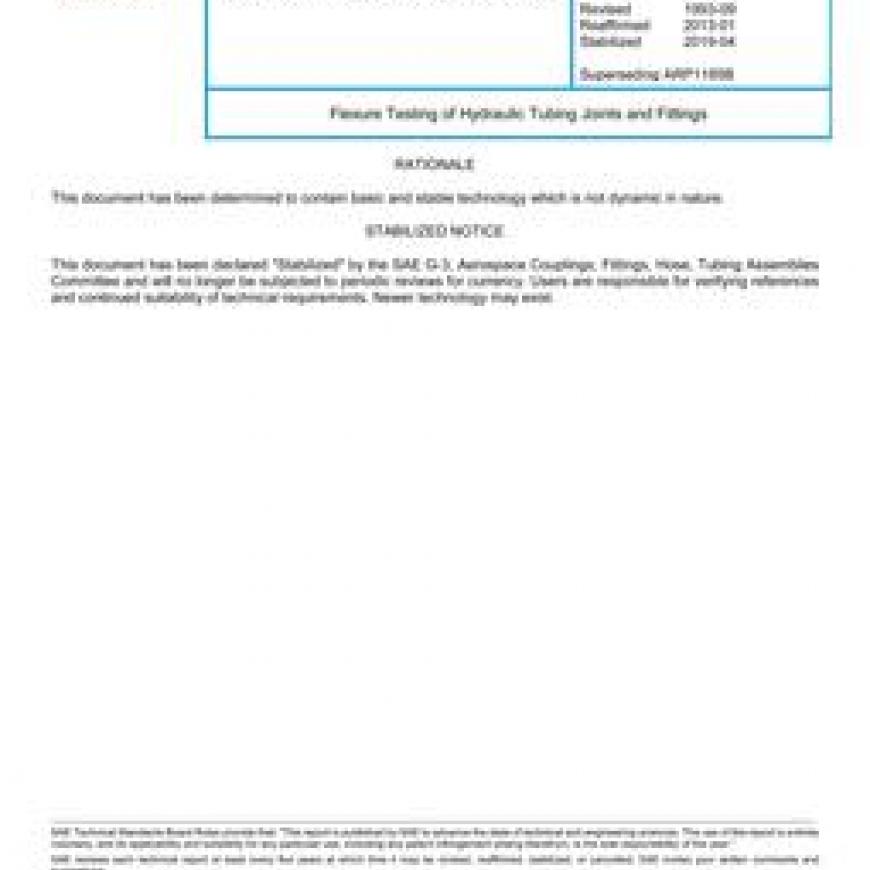 This SAE Recommended Practice (ARP) establishes flexure test procedures to determine and classify the fatigue strengths of reconnectable or permanent hydraulic tube joints.The procedure is intended for conducting flexure tests of fittings and joints for hydraulic tubing materials such as AMS 5561 (21Cr-6Ni-9Mn) steel or AMS 4944 (3AL-2.5V) titanium.A mean stress is applied by holding system pressure in the specimens and flexing in a rotary or planar bending test machine.