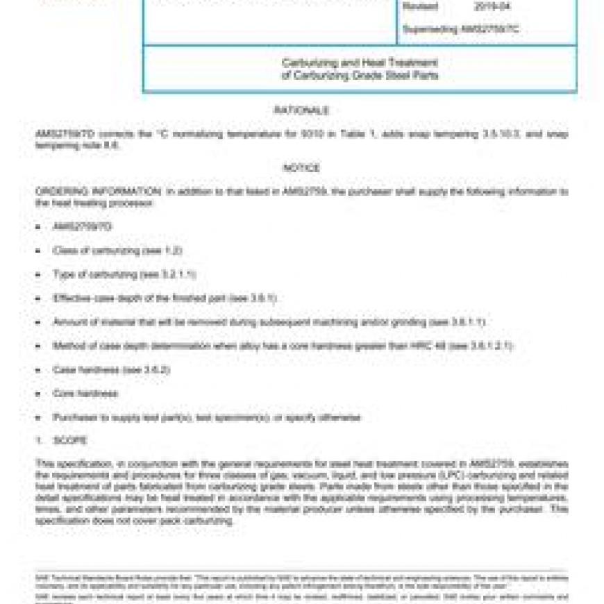 This specification, in conjunction with the general requirements for steel heat treatment covered in AMS2759, establishes the requirements and procedures for three classes of gas, vacuum, liquid, and low pressure (LPC) carburizing and related heat treatment of parts fabricated from carburizing grade steels. Parts made from steels other than those specified in the detail specifications may be heat treated in accordance with the applicable requirements using processing temperatures, times, and other parameters recommended by the material producer unless otherwise specified by the purchaser. This specification does not cover pack carburizing.