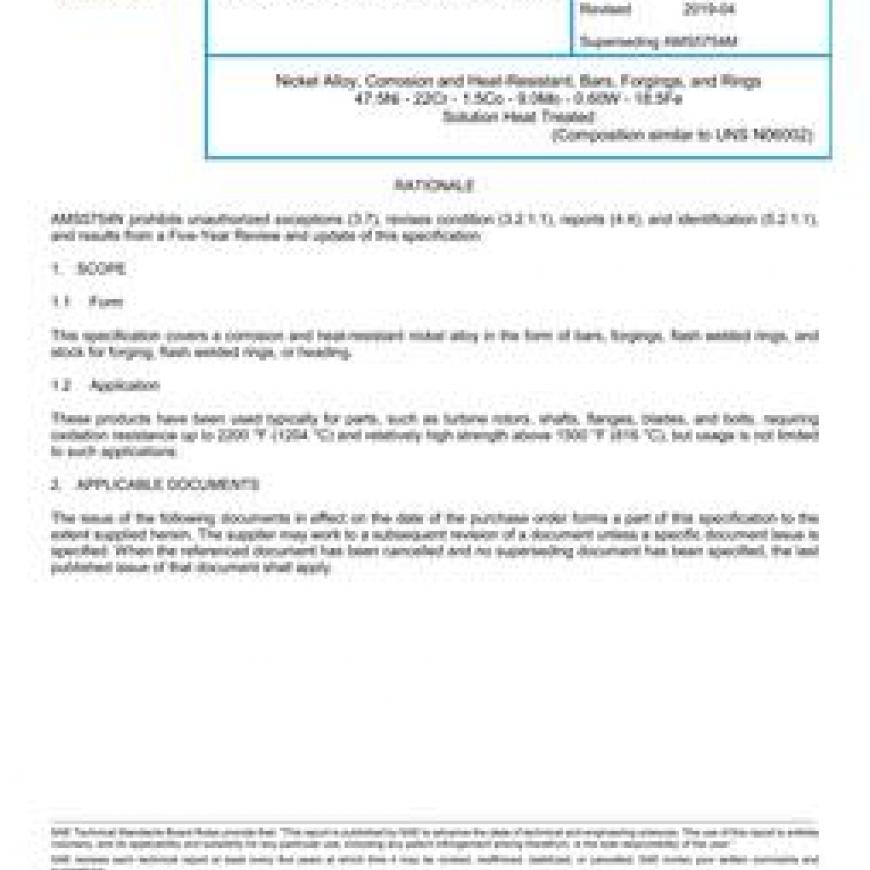 SAE AMS5754N Nickel Alloy, Corrosion and Heat-Resistant, Bars, Forgings, and Rings 47.5Ni - 22Cr - 1.5Co - 9.0Mo - 0.60W - 18.5Fe Solution Heat Treated