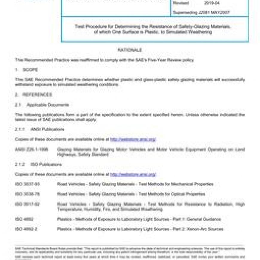 SAE J2081_201904 Test Procedure for Determining the Resistance of Safety-Glazing Materials, of which One Surface is Plastic, to Simulated Weathering