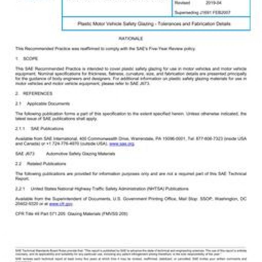 This SAE Recommended Practice is intended to cover plastic safety glazing for use in motor vehicles and motor vehicle equipment. Nominal specifications for thickness, flatness, curvature, size, and fabrication details are presented principally for the guidance of body engineers and designers. For additional information on plastic safety glazing materials for use in motor vehicles and motor vehicle equipment, please refer to SAE J673.