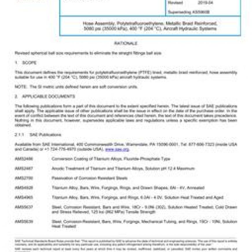 This document defines the requirements for polytetrafluoroethylene (PTFE) lined, metallic braid reinforced, hose assembly suitable for use in 400 degrees F (204 degrees C), 5080 psi (35000 kPa) aircraft hydraulic systems.NOTE: The SI metric units defined herein are soft conversion units.