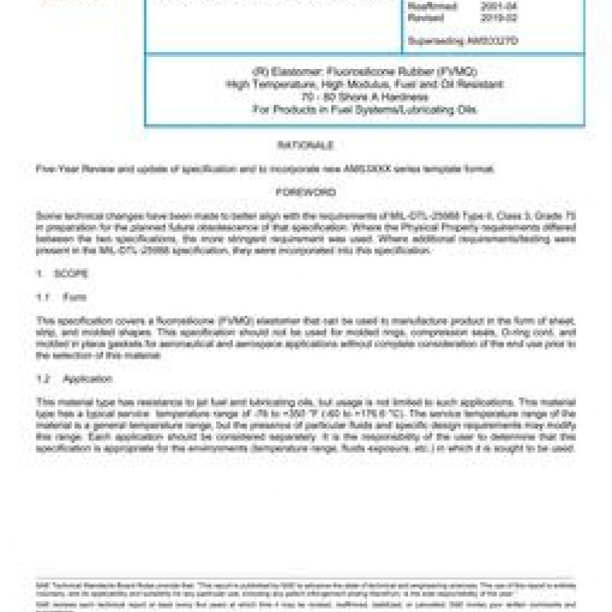This specification covers a fluorosilicone (FVMQ) elastomer that can be used to manufacture product in the form of sheet, strip, and molded shapes. This specification should not be used for molded rings, compression seals, O-ring cord, and molded in place gaskets for aeronautical and aerospace applications without complete consideration of the end use prior to the selection of this material.
