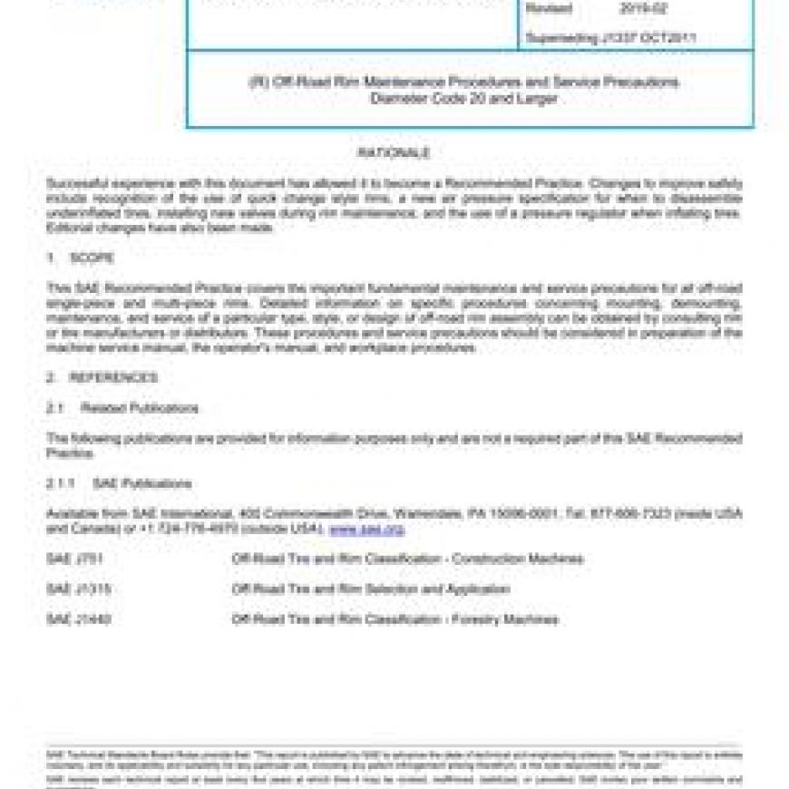 This SAE Recommended Practice covers the important fundamental maintenance and service precautions for all off-road single-piece and multi-piece rims. Detailed information on specific procedures concerning mounting, demounting, maintenance, and service of a particular type, style, or design of off-road rim assembly can be obtained by consulting rim or tire manufacturers or distributors. These procedures and service precautions should be considered in preparation of the machine service manual, the operator's manual, and workplace procedures.