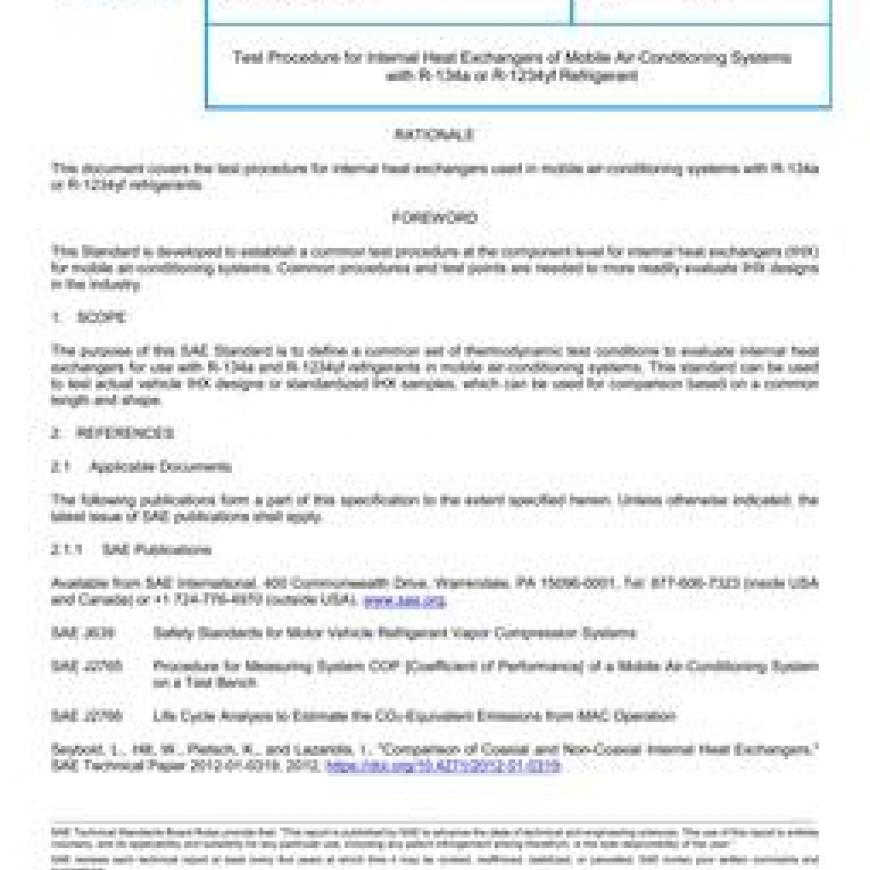 The purpose of this SAE Standard is to define a common set of thermodynamic test conditions to evaluate internal heat exchangers for use with R-134a and R-1234yf refrigerants in mobile air-conditioning systems. This standard can be used to test actual vehicle IHX designs or standardized IHX samples, which can be used for comparison based on a common length and shape.