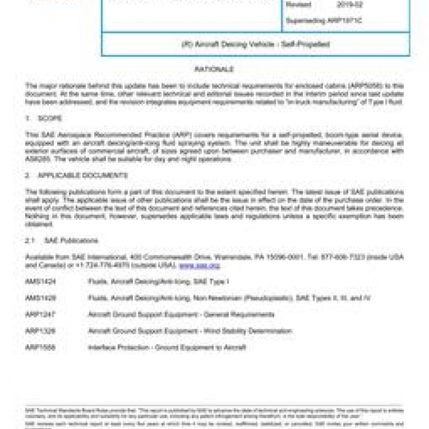This SAE Aerospace Recommended Practice (ARP) covers requirements for a self-propelled, boom-type aerial device, equipped with an aircraft deicing/anti-icing fluid spraying system. The unit shall be highly maneuverable for deicing all exterior surfaces of commercial aircraft, of sizes agreed upon between purchaser and manufacturer, in accordance with AS6285. The vehicle shall be suitable for day and night operations.