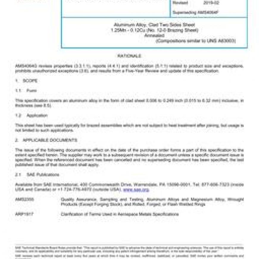 SAE AMS4064G Aluminum Alloy, Clad Two Sides Sheet 1.25Mn - 0.12Cu (No. 12-0 Brazing Sheet) Annealed