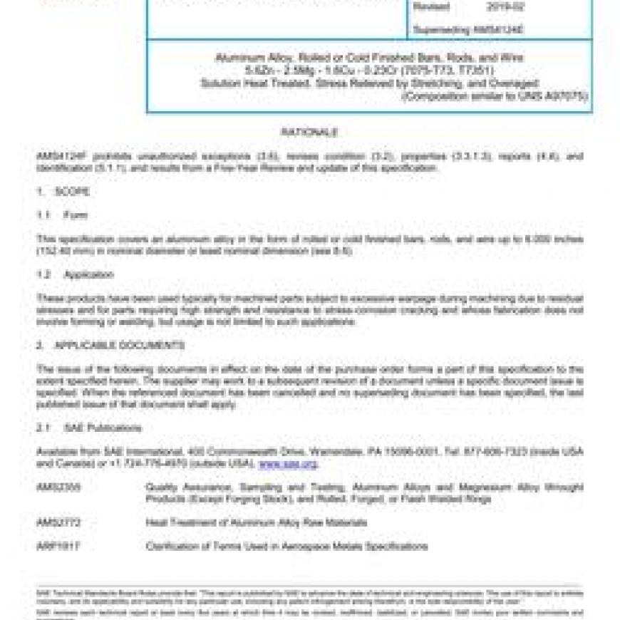 SAE AMS4124F Aluminum Alloy, Rolled or Cold Finished Bars, Rods, and Wire 5.6Zn - 2.5Mg - 1.6Cu - 0.23Cr (7075-T73, T7351) Solution Heat Treated, Stress Relieved by Stretching, and Overaged