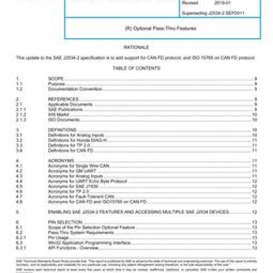 SAE J2534-1 defines a standard vehicle network interface that can be used to reprogram emission-related control modules. However, there is a need to support vehicles prior to the 2004 model year, as well as non-emission related control modules.The SAE J2534-2 document meets these needs by detailing extensions to an SAE J2534-1 specification. It is not required for an interface to be fully compliant with SAE J2534-1 specification to implement some of the features specified in this document. Together, these extensions provide the framework for a common interface to protect the software investment of the Vehicle OEMs and Scan Tool manufacturers.Only the optional features will be described by this document and are based on the December 2004 publication of SAE J2534-1.