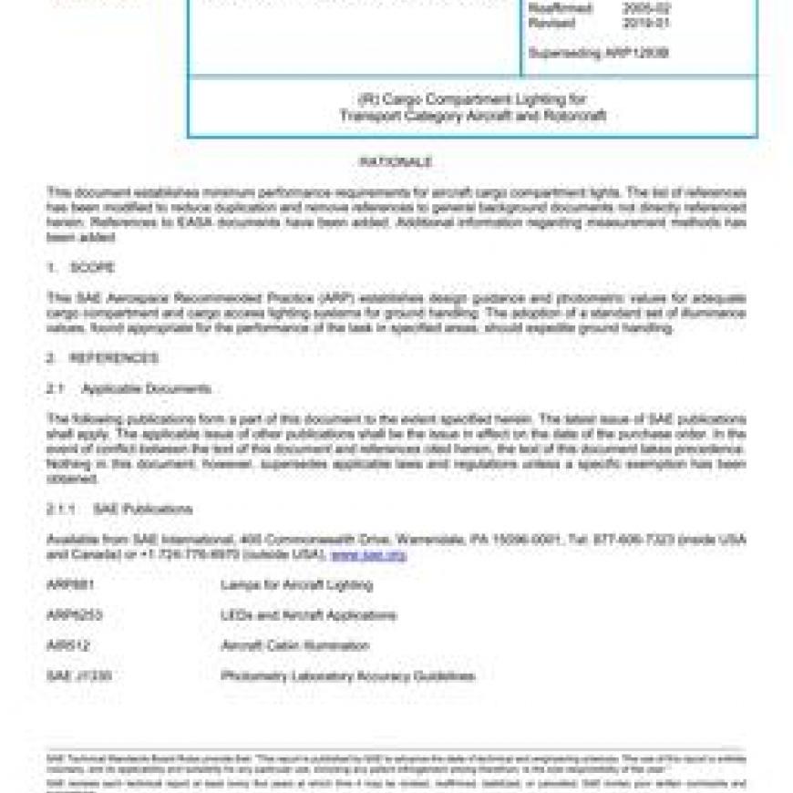 This SAE Aerospace Recommended Practice (ARP) establishes design guidance and photometric values for adequate cargo compartment and cargo access lighting systems for ground handling. The adoption of a standard set of illuminance values, found appropriate for the performance of the task in specified areas, should expedite ground handling.