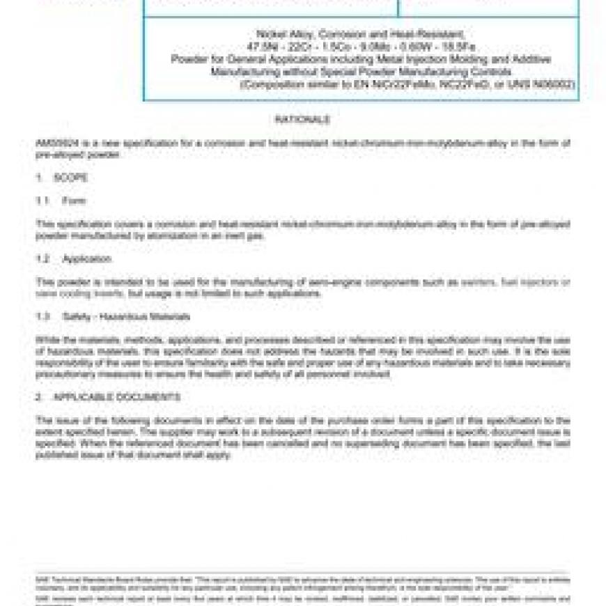 SAE AMS5924 Nickel Alloy, Corrosion and Heat-Resistant, 47.5Ni - 22Cr - 1.5Co - 9.0Mo - 0.60W - 18.5Fe Powder for General Applications including Metal Injection Molding and Additive Manufacturing without Special Powder Manufacturing Controls