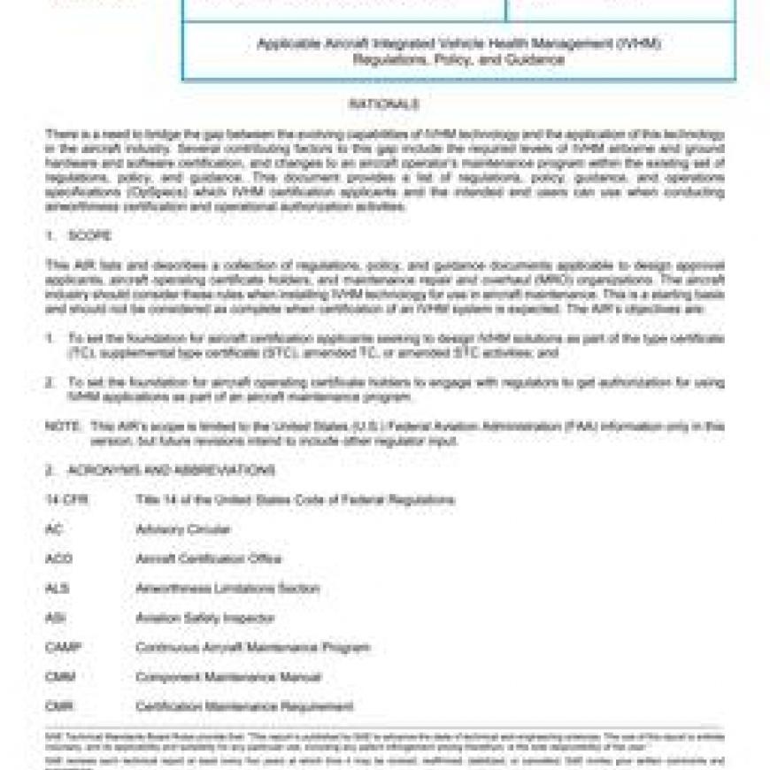 This AIR lists and describes a collection of regulations, policy, and guidance documents applicable to design approval applicants, aircraft operating certificate holders, and maintenance repair and overhaul (MRO) organizations. The aircraft industry should consider these rules when installing IVHM technology for use in aircraft maintenance. This is a starting basis and should not be considered as complete when certification of an IVHM system is expected. The AIR's objectives are:1. To set the foundation for aircraft certification applicants seeking to design IVHM solutions as part of the type certificate (TC), supplemental type certificate (STC), amended TC, or amended STC activities; and2. To set the foundation for aircraft operating certificate holders to engage with regulators to get authorization for using IVHM applications as part of an aircraft maintenance program.NOTE: This AIR's scope is limited to the United States (U.S.) Federal Aviation Administration (FAA) information only in this version, but future revisions intend to include other regulator input.